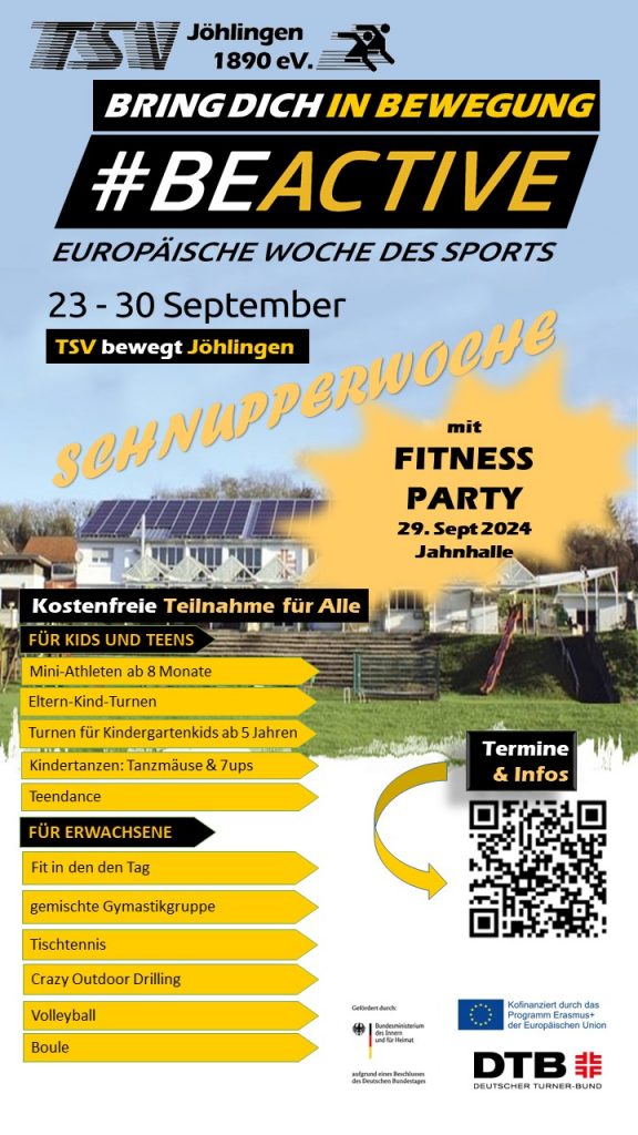 Der TSV Jöhlingen beteiligt sich an der „Europäischen Woche des Sports“ vom 23. – 30. September 2023 und setzt damit ein Zeichen für ein aktiveres und gesünderes Europa. Der TSV lädt alle Interessierten zum Schnuppern ein, um Sportprogramme zu besuchen und sich zu bewegen. Dazu öffnet der TSV Jöhlingen die ganze Woche sein Sportprogramm für Nicht-Mitglieder. Alle sind herzlich eingeladen die Angebote zu nutzen, sich zu bewegen und den TSV Jöhlingen kennenzulernen. Einfach vorbeikommen, eine Anmeldung ist nicht erforderlich.