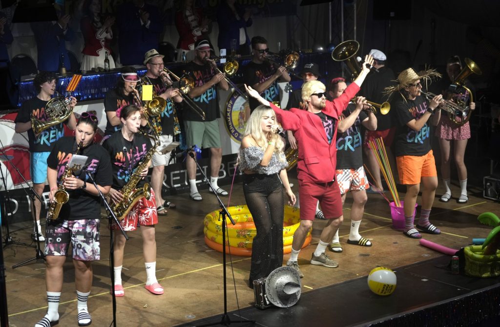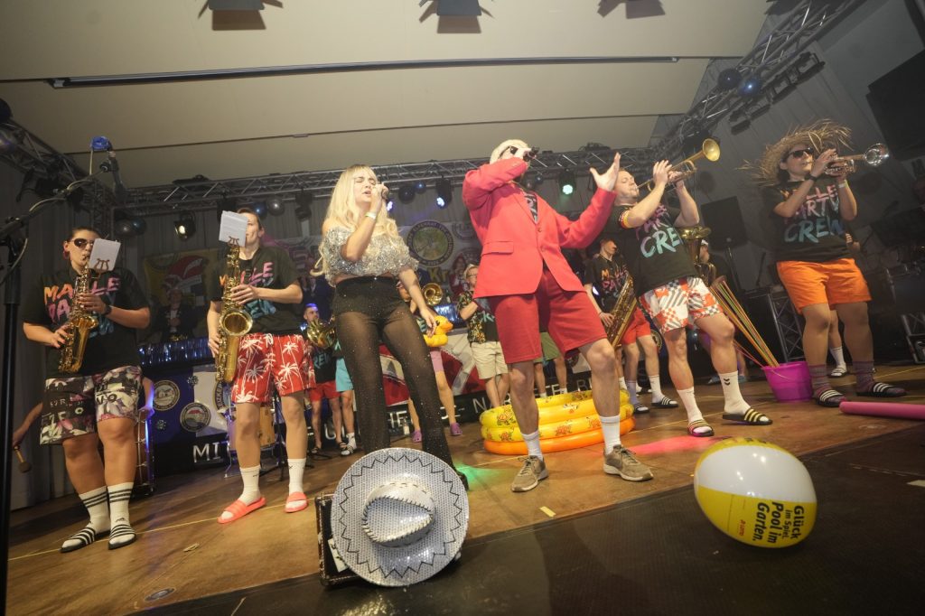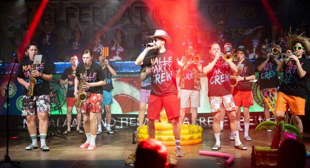 Elferrat and Friends machten in diesem Jahr eine Reise zum Ballermann. Mit der Frontfrau Hannah Gromer und in bewährter Qualität Stefan Keller am Gesang feierten sie mit dem Publikum eine Malle-Party im Stehen. In schneller Taktung wurden die größten Malle-Hits der letzten 20 Jahre dankbar mit dem Publikum abgefeiert. Nach der Einleitung „Ab in den Süden“, startete der Flieger beim neuen Hit „Auf geht’s nach Malle“ über „La Bamba“ bis auf den Partyplanet. Auf Malle gab es das große Finale mit „Wackelkontakt“, „Bella Napoli“ und „Delfin in der Bauchtasche“. Zugabe „Gute Laune“. Einstudiert wurde die Malle-Crew von Gruppenpilotin Nadine Kellenberger.