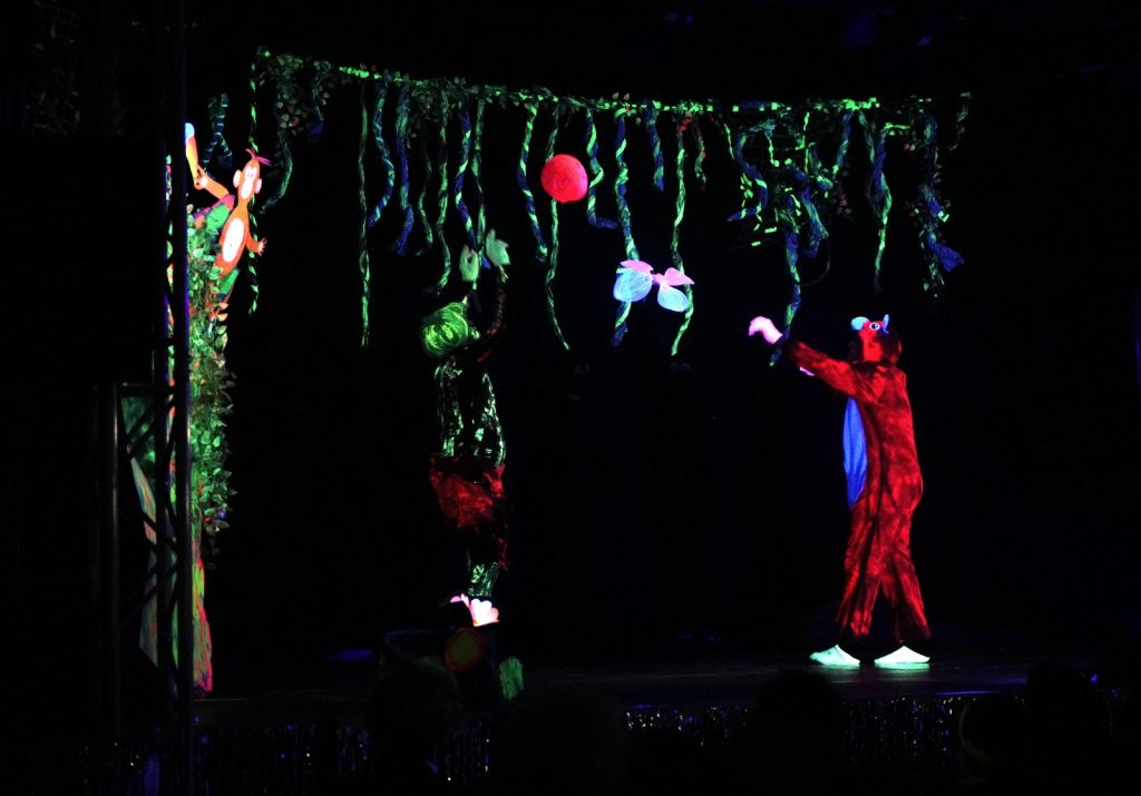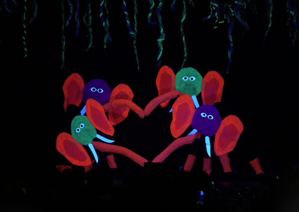Frei nach den Vorlagen des Dschungelbuchs und Königs der Löwen und mit dem Titel „Tohuwabohu im Dschungel“ interpretierten die Volleyballer and friends in ihrer Schwarzlichtshow Eindrücke aus dem Leben des Mogli im Dschungel – vom Sonnenaufgang mit der Geburt des Mogli, über das Erwachen des Dschungels am Morgen bis zum späteren Zusammentreffen mit den Tieren des Dschungels. Manch einer hat Balu den Bär, Kaa die Schlange, die Affenbande oder die Elefantenparade aus dem Dschungelbuch sofort erkannt. Die Reise durch den Dschungel endete mit einem Zusammentreffen mit den Menschen, die in Form von trommelnden Mädchen ins Leben des Mogli kamen und gemeinsam das 50-jährige Jubiläum der Volleyballgruppe feierten.