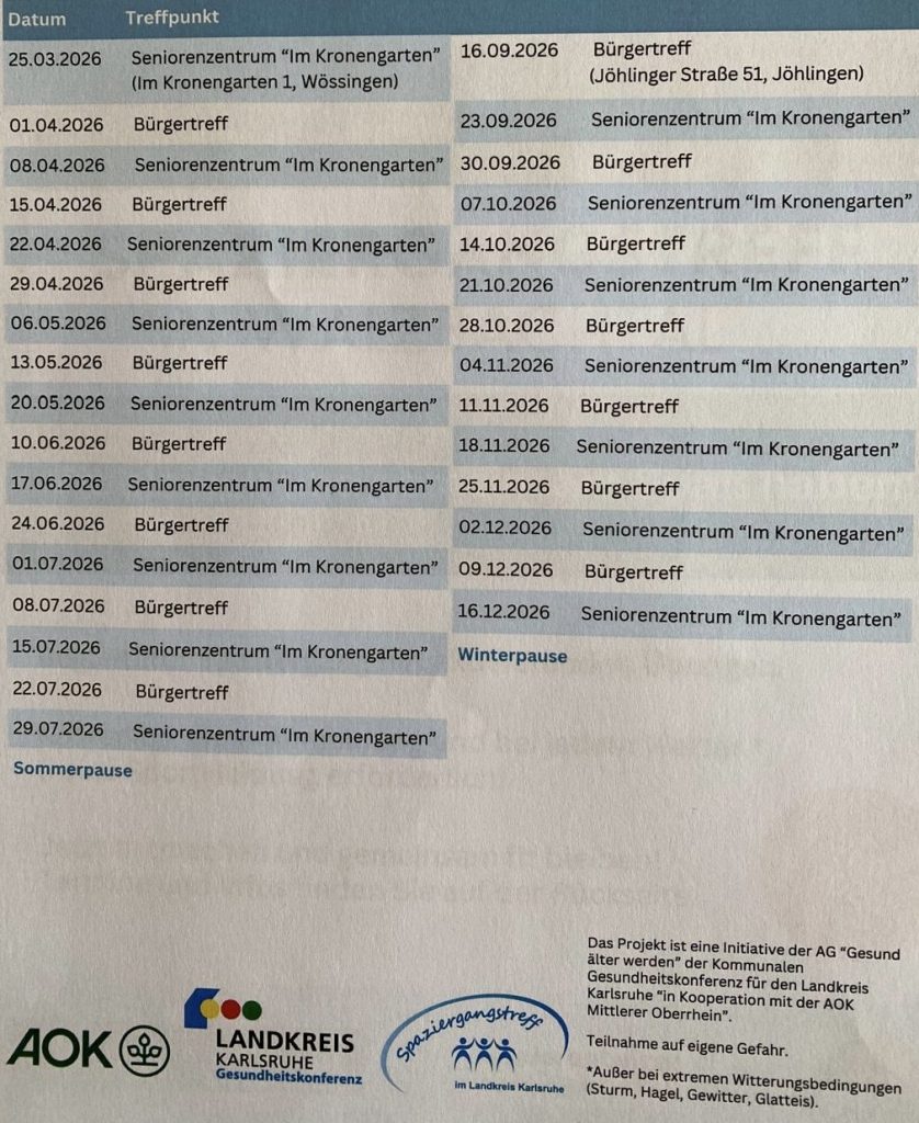 Treffpunkt ist immer mittwochs um 10:00 Uhr,abwechselnd beim Bürgertreff sowie beim Seniorenzentrum „Im Kronengarten“. Das Angebot besteht aus einem einstündigen, begleiteten Spaziergang an der frischen Luft, mit einfachen Übungen. Eingeladen sind alle, die gern gemeinsam mit anderen spazieren gehen möchten.